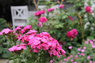 Endel av rosene har begynt blomstringen,å duften sprer seg i hagen...For ikke å snakke om nellikene og klatrehortensiaens blomster,det er virkelig mange gode dufter:)